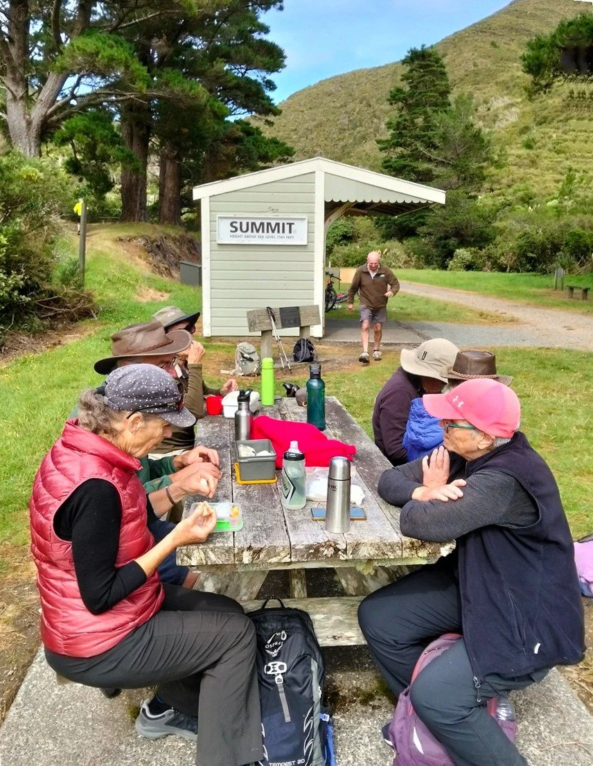 Whanganui Tramping Club members enjoy lunch at Summit, the highest point on the Remutaka Rail Trail.